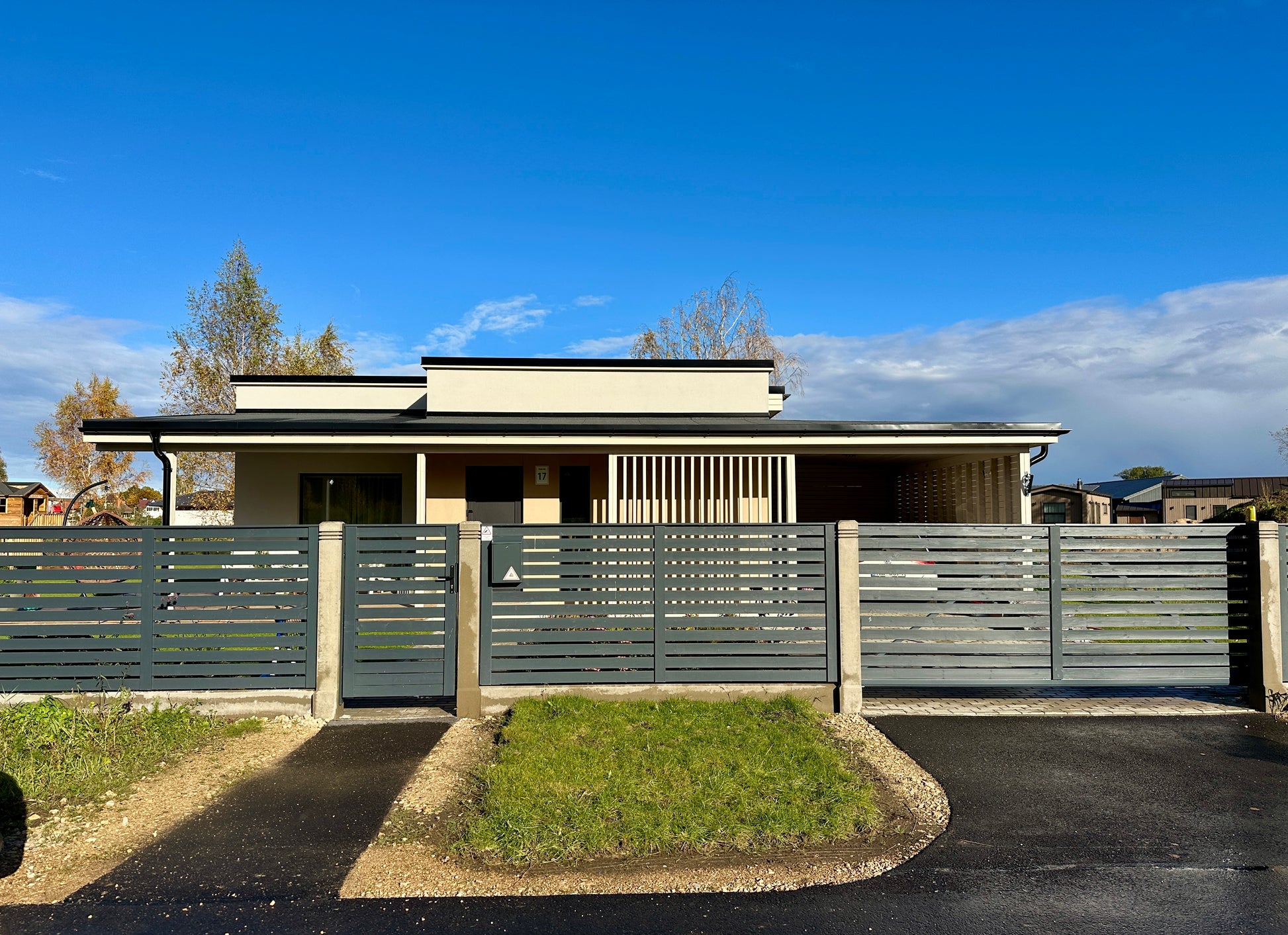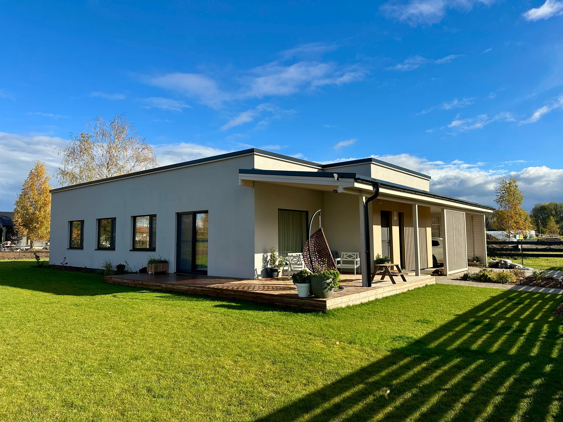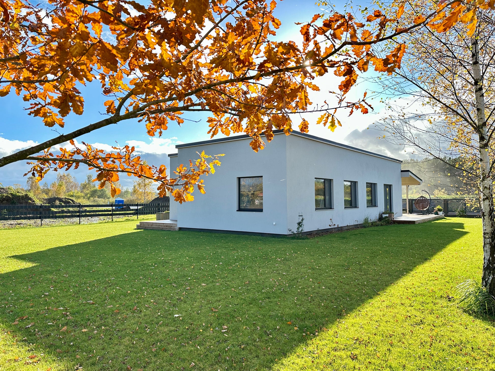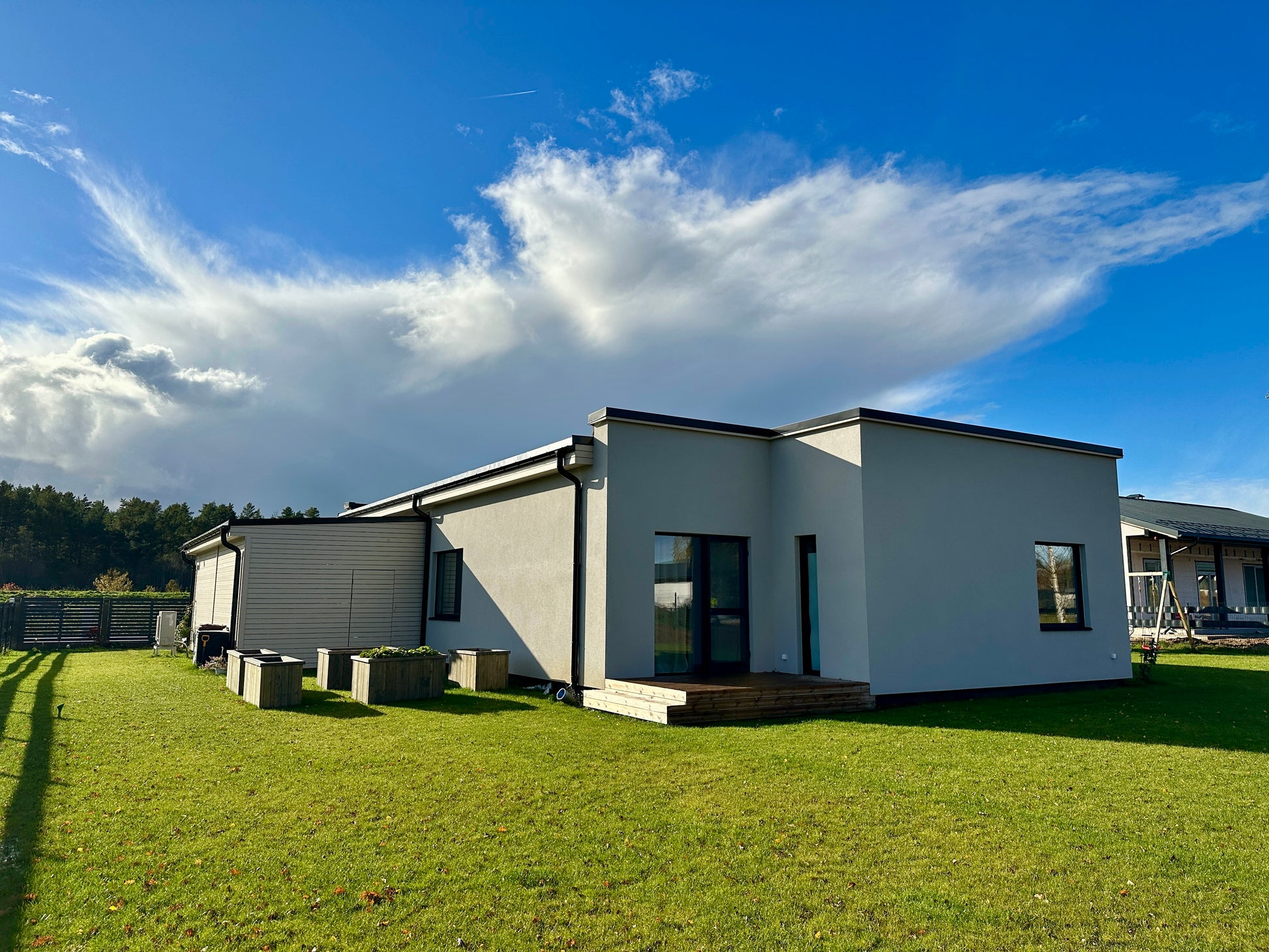 Fasādes apdare - cementšķiedra un koks.